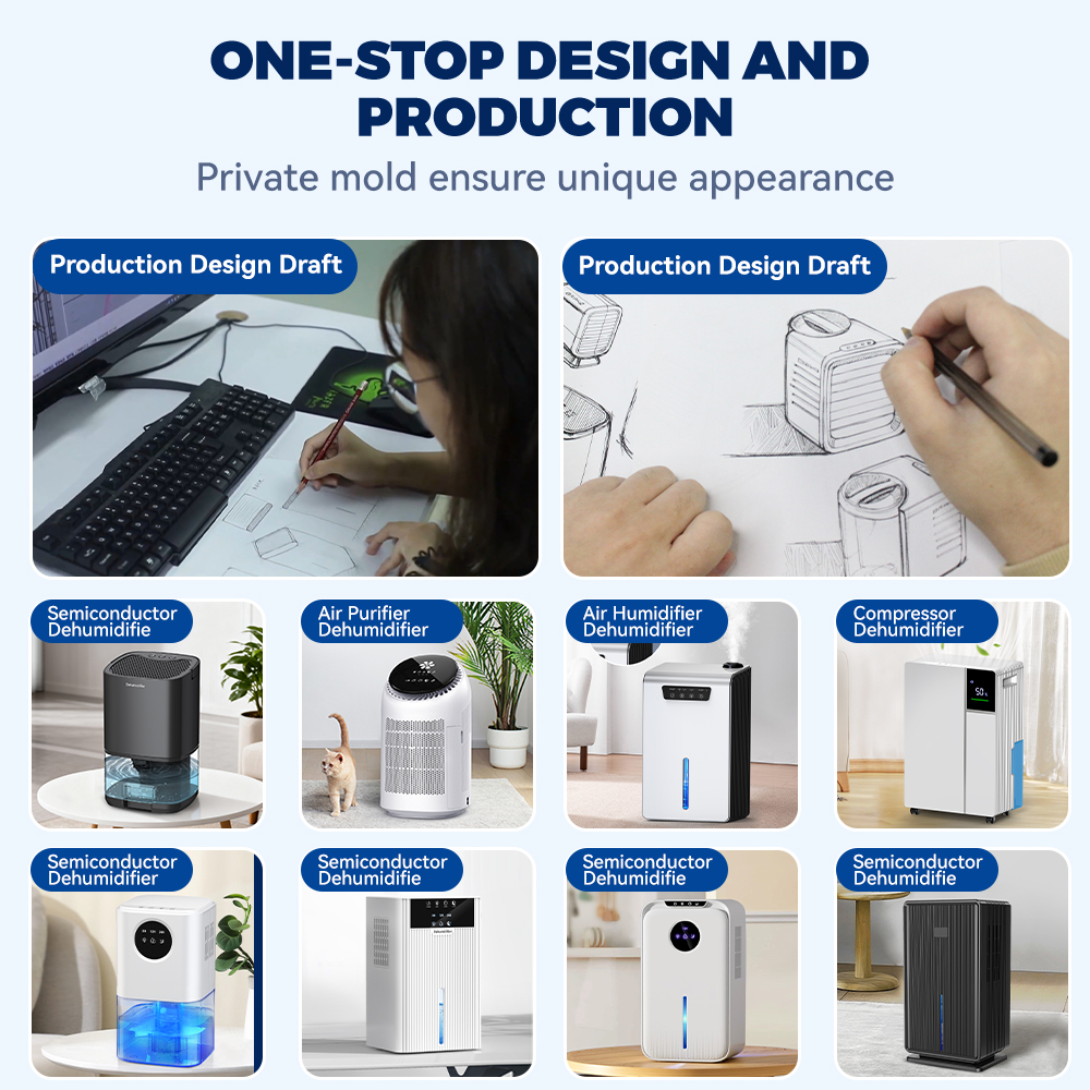We offer a one-stop service for dehumidifier design and manufacturing: utilizing our proprietary molds to create unique product appearances, from detailed computer-aided design drafts to hand-drawn prototype concepts, ensuring the uniqueness of the product throughout the entire process. We currently offer a diverse range of household models, including semiconductor dehumidifiers, air purifying dehumidifiers, humidifying and dehumidifying integrated units, and compressor dehumidifiers. These models are suitable for various spaces in homes worldwide, such as apartments, bathrooms, and basements, meeting both market expectations for product differentiation and covering diverse user scenarios.